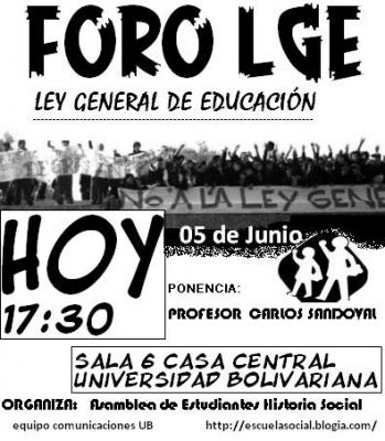 Al Foro LGE (Ley General de Educación) a realizarse hoy 05 de Junio a las 17:30 hrs. en la sala 6, casa Central Universidad Bolivariana.